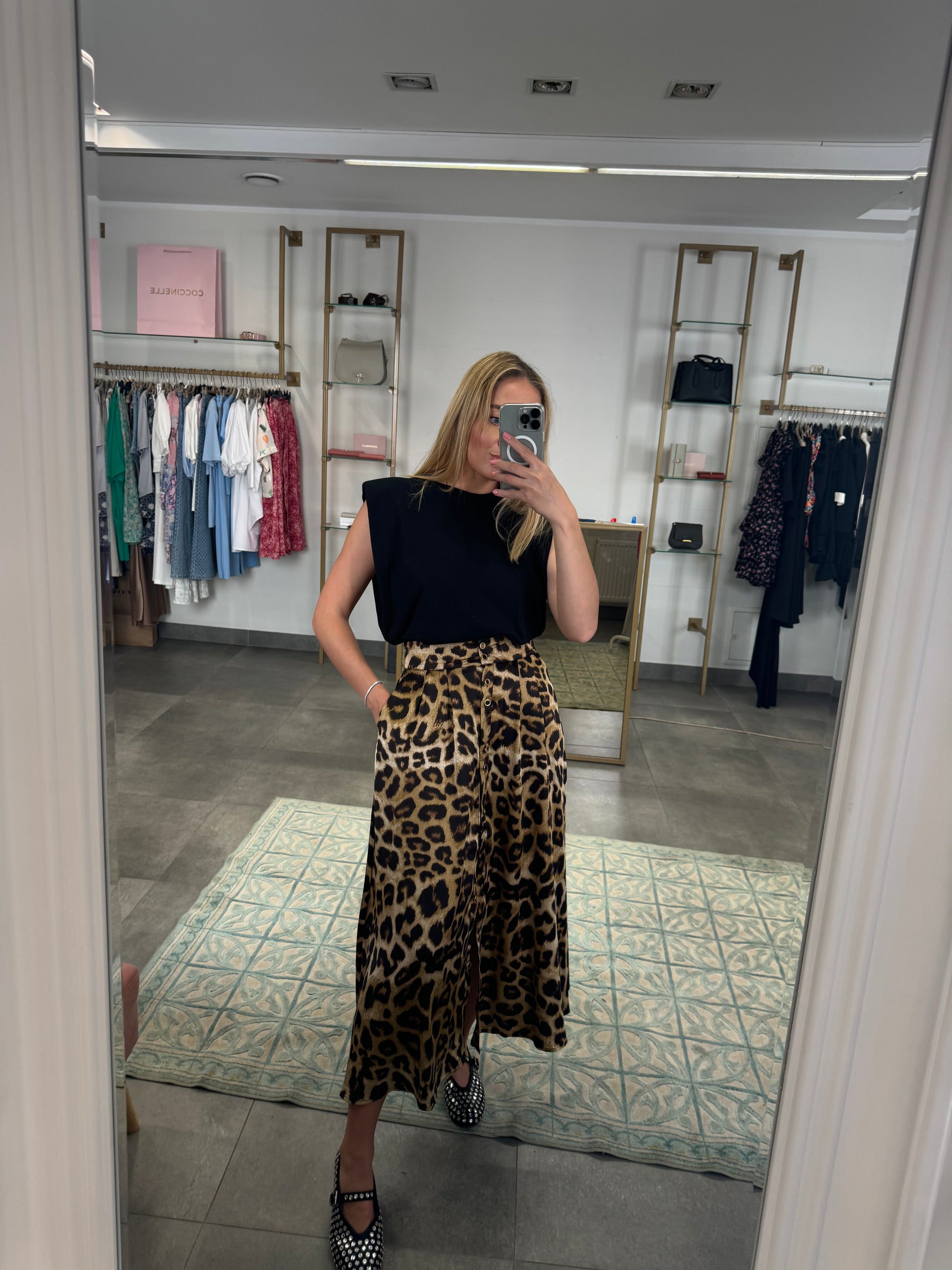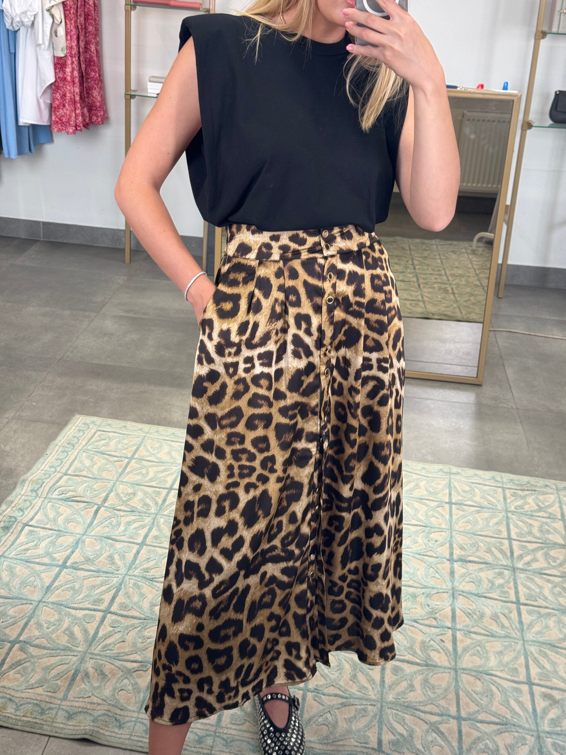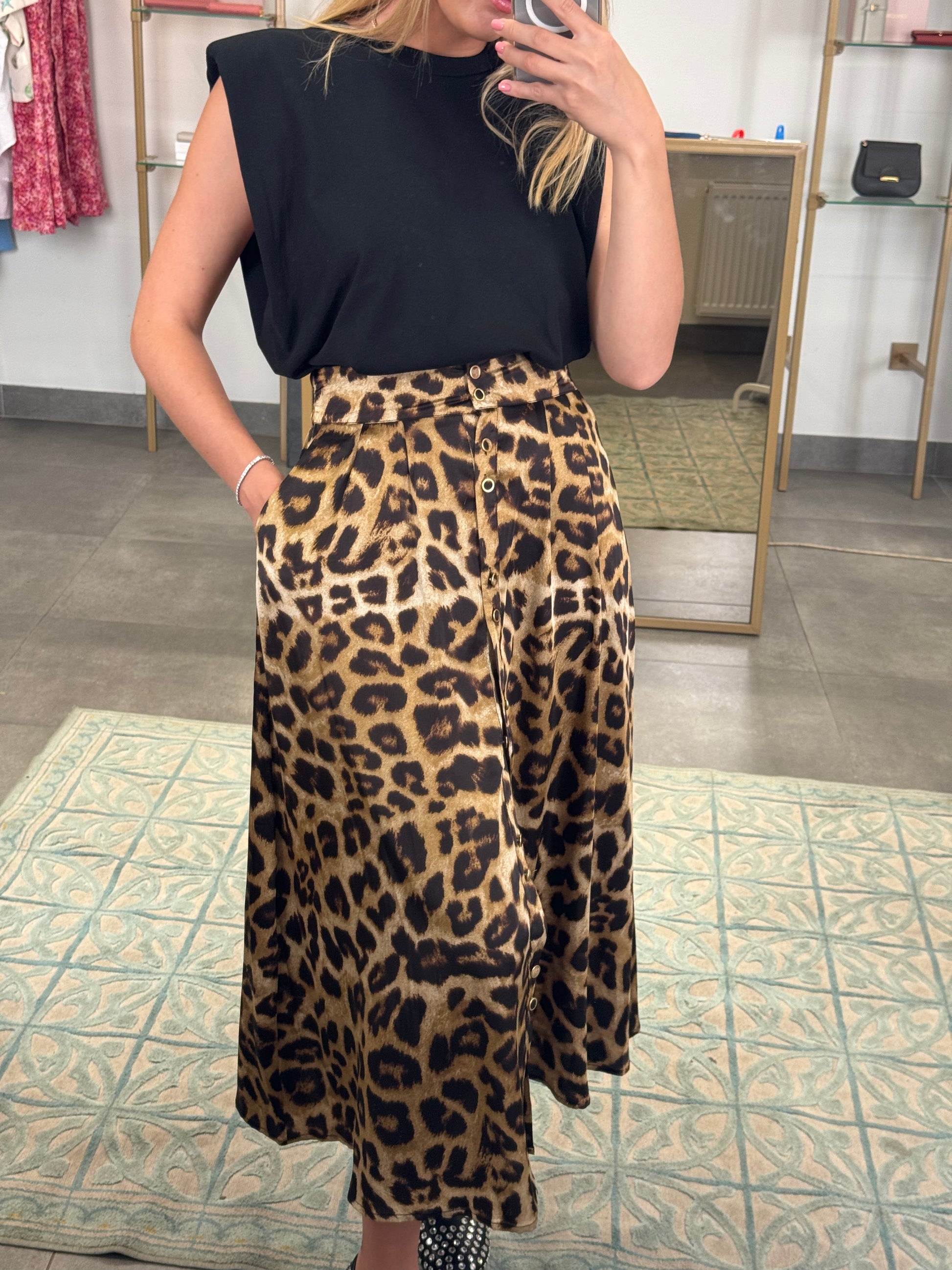 Leopardo rašto sijonas. Priekyje užsisega sagutėmis, o iš galo ties juosmeniu eina tampri guma.