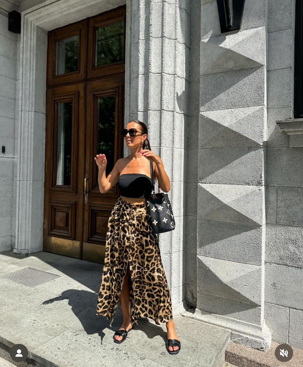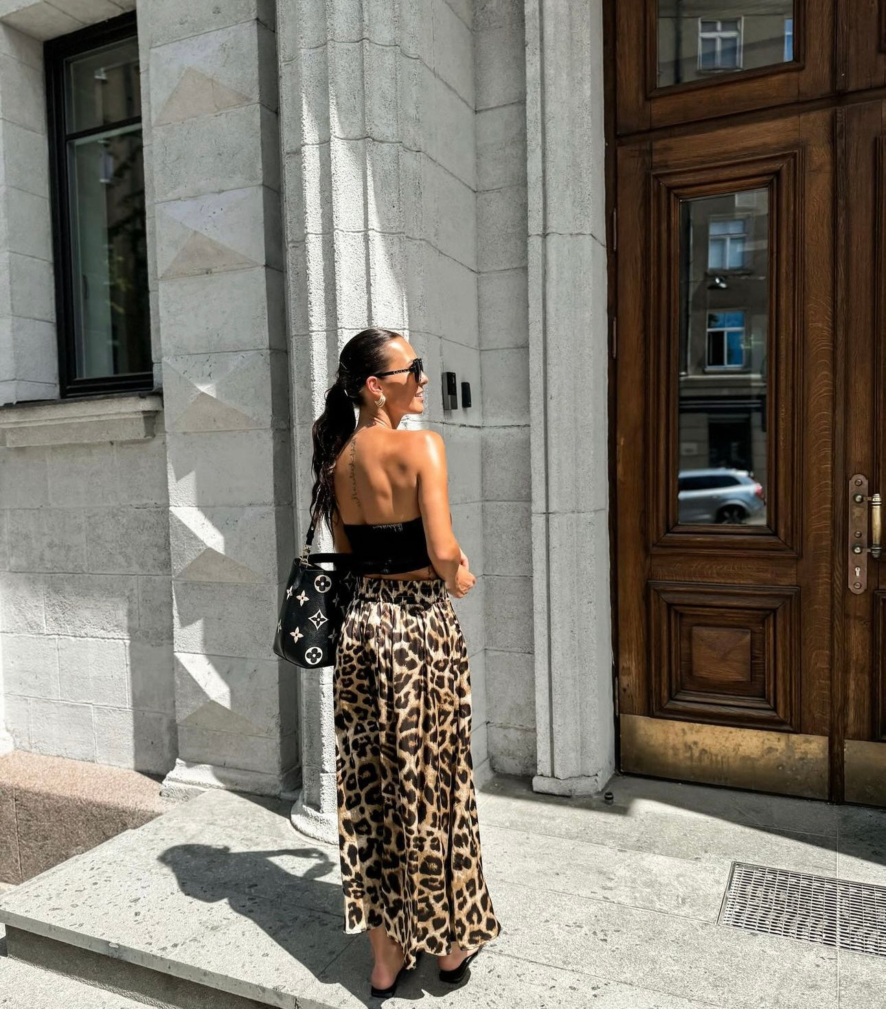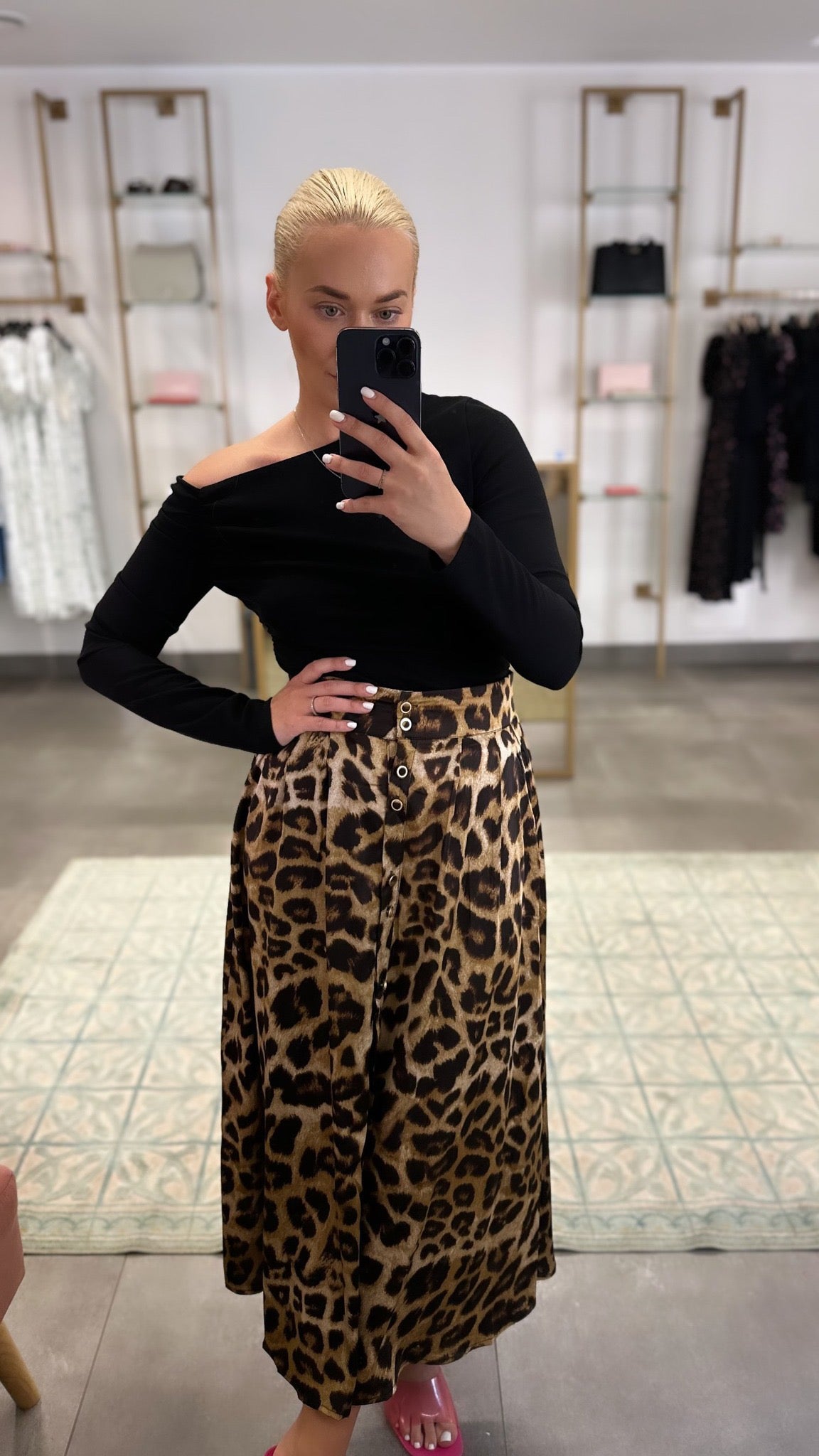 Leopardo rašto sijonas. Priekyje užsisega sagutėmis, o iš galo ties juosmeniu eina tampri guma.